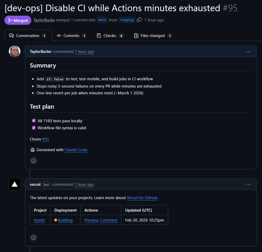 That same context carried forward. When our GitHub Actions minutes ran out mid-session and every CI job started failing in five seconds, Claude had already seen the failures on multiple PRs. So when I said "let's create an issue for this," the resulting ticket wasn't a stub I'd need to flesh out later. It included the problem statement, goals, considerations, and technical details — all pulled from what we'd already encountered together.
